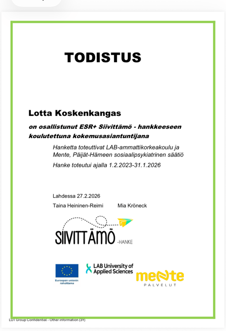Voin toimia tukihenkilönä, esimerkiksi tapaamisissa* tai muissa tilanteissa, joissa asiakas tarvitsee toisen henkilön tukea mm